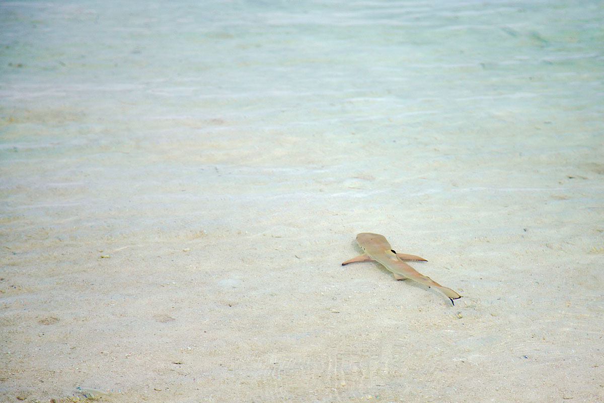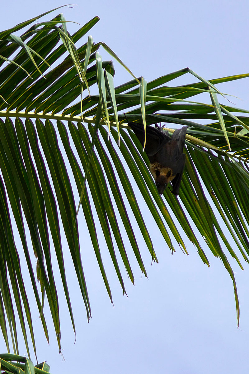 We met a baby black‑tip reef shark cruising the shallows. The locals insisted they’re “vegetarian.” Sure. Absolutely. No doubt. A flying fox — the local “bird” — swooped overhead.