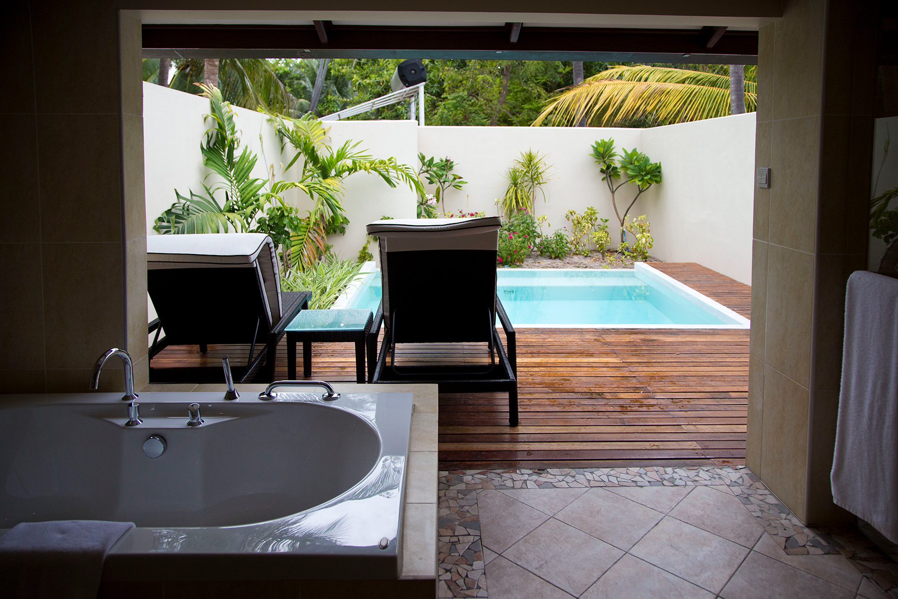 After two days in paradise, we returned to Malé. Just ten minutes from the capital, we made another stop — this time at Kurumba, a larger, livelier resort with a completely different energy. More people, more activity, and a garden villa that came with its own outdoor bathroom and private pool. Spacious, lush, and full of tropical charm.
