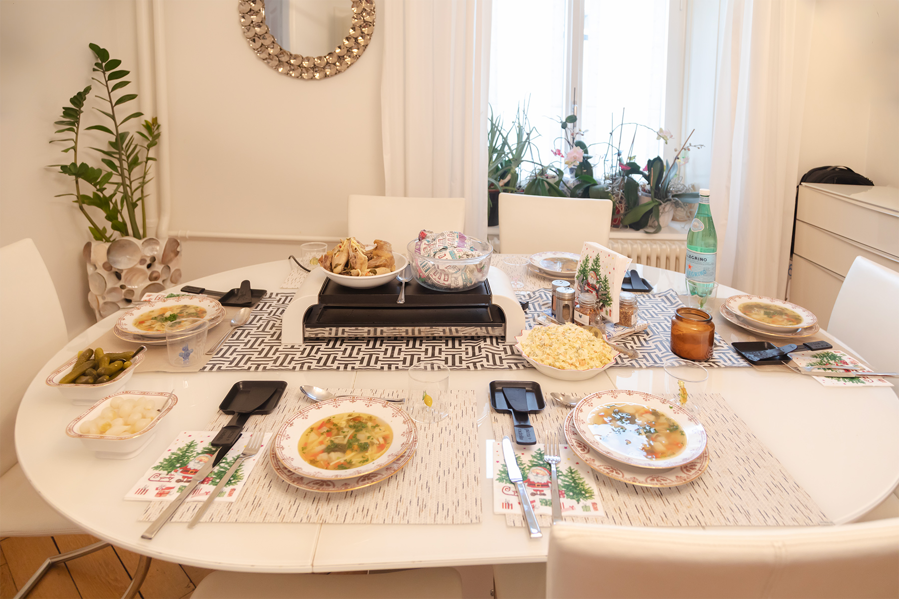 Later, we were welcomed by my middle school friend for a cozy Moldovan‑Swiss lunch: zeama / soup, Olivie salad, and raclette (melted cheese over potatoes).