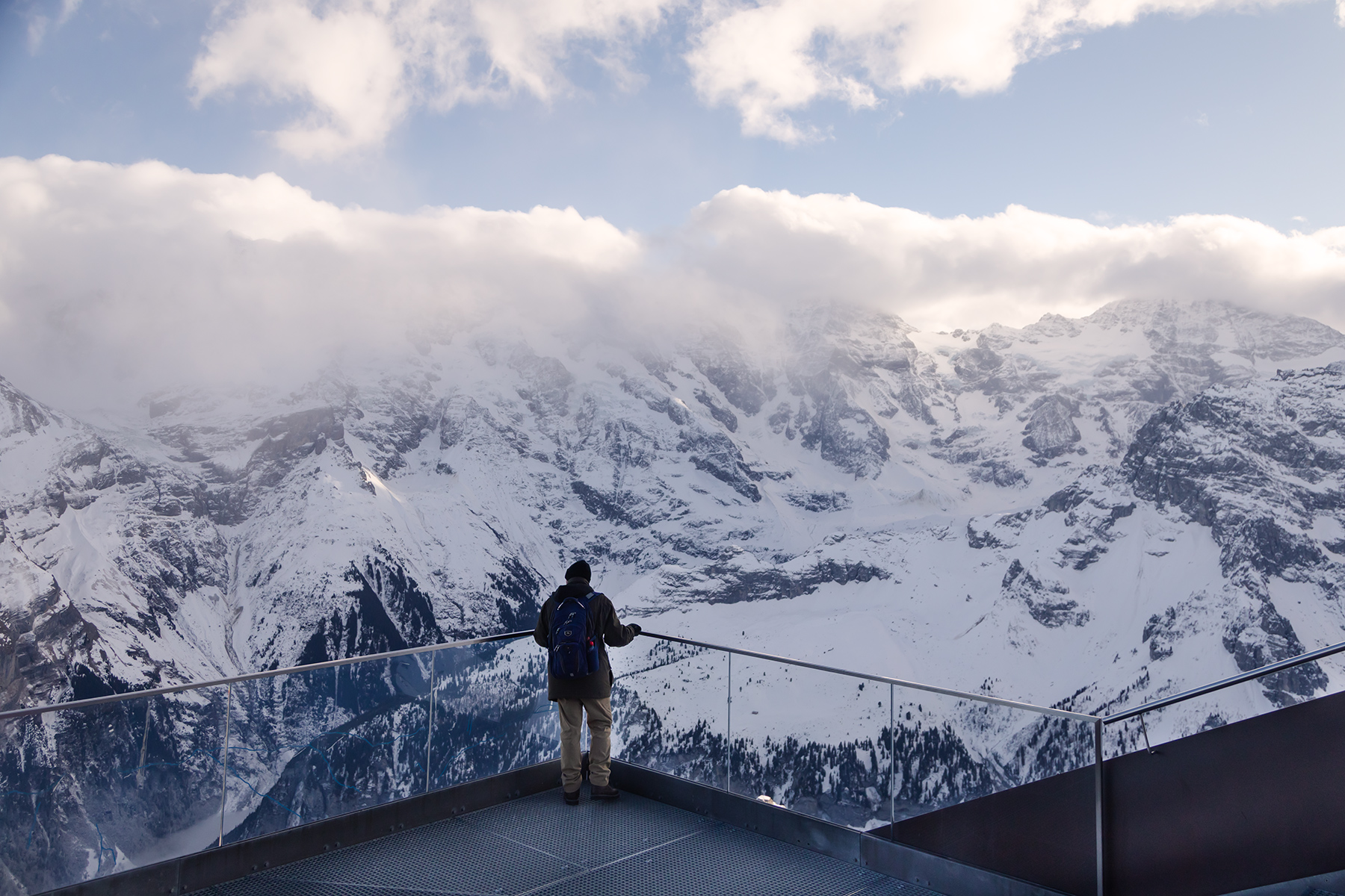 We dropped our bags and headed straight up to the Schilthorn. We had lunch at the rotating restaurant, and at Birg we braved the “thrill walk.” S confidently walked across a narrow cable without hesitation.