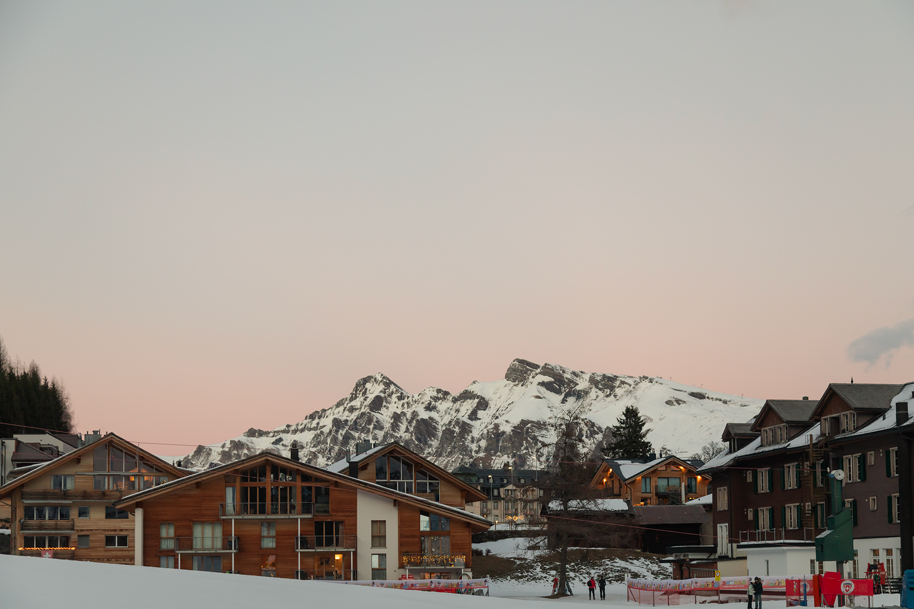 That evening, we stumbled upon a small sledding spot with panoramic mountain views and learned about a larger 3‑km sledding path accessible by train. Our hotel room had an amazing view to the mountains, and despite the cold, we savored a drink on the balcony as the sun set.