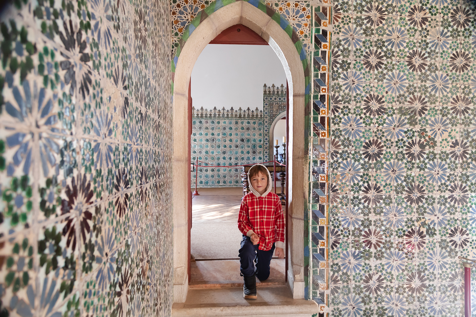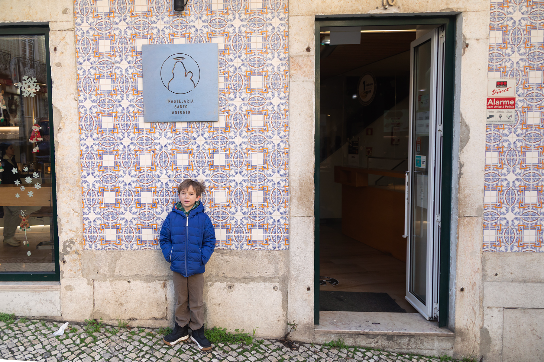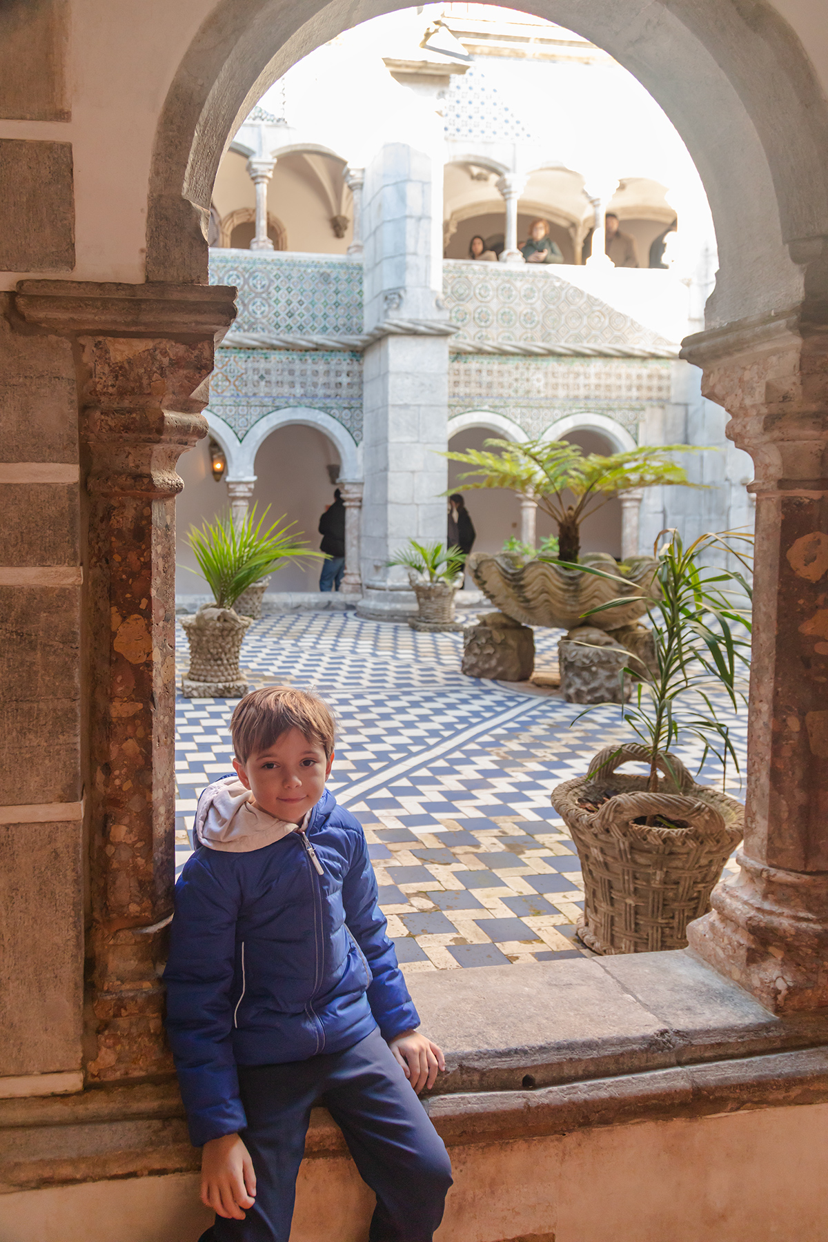 Another half‑hour walk brought us to the National Palace of Sintra, a royal residence for centuries. S was thrilled by a free carousel ride at the Christmas market in front of the palace before we explored inside.