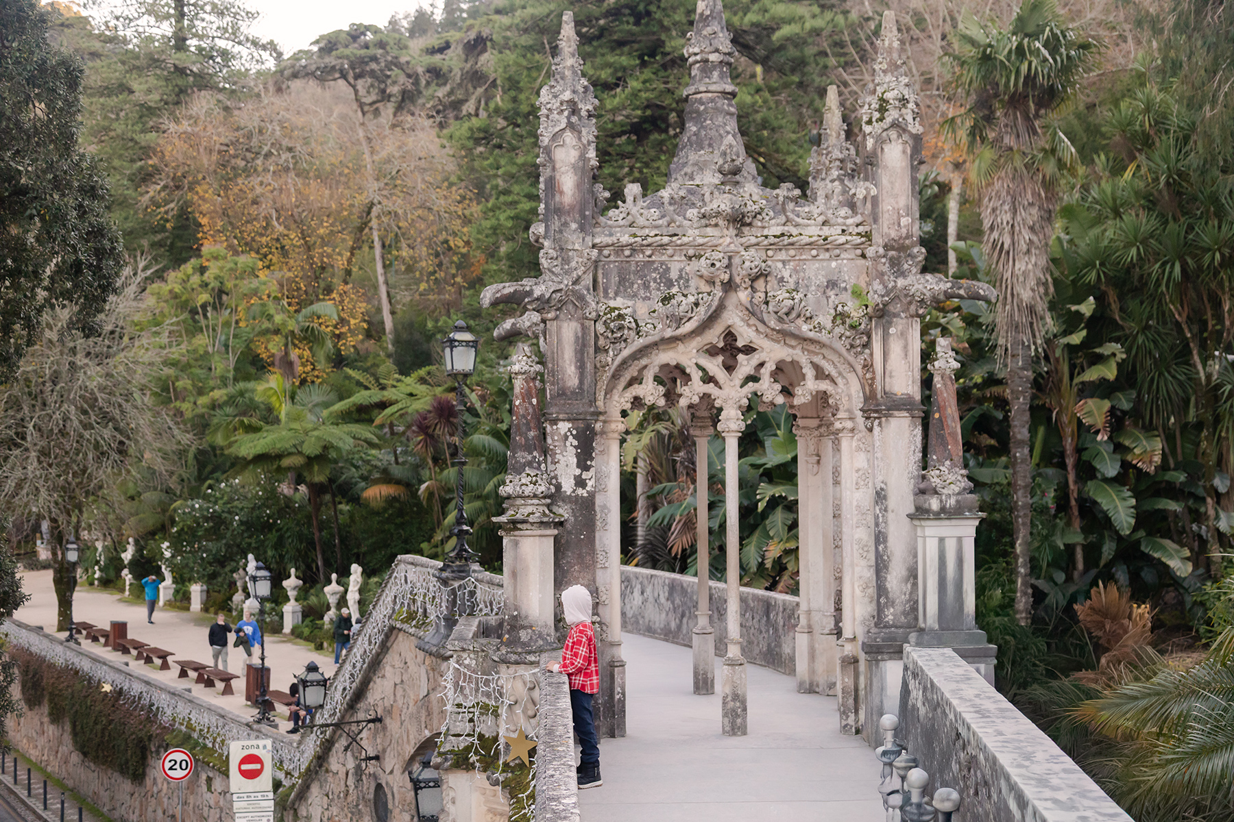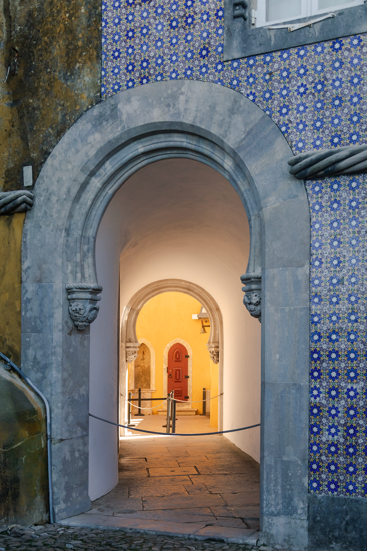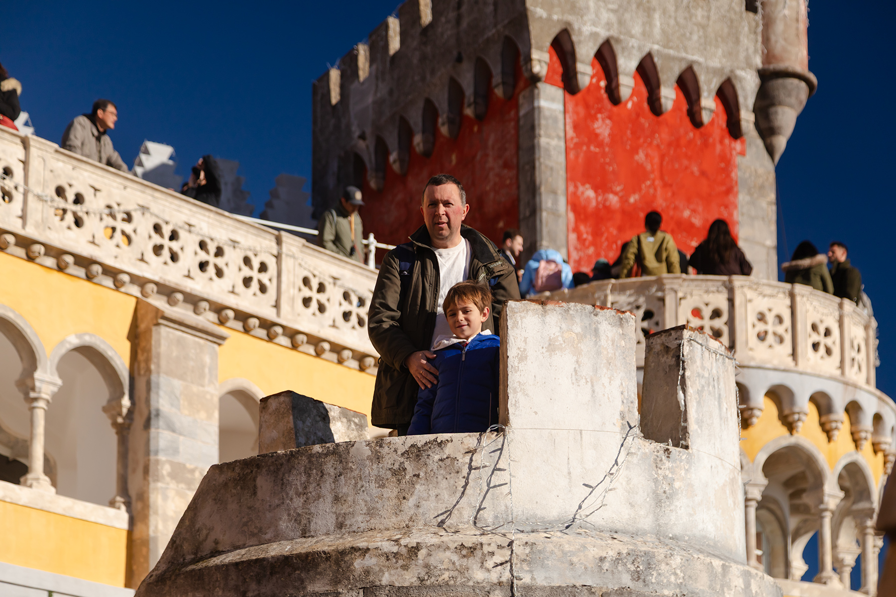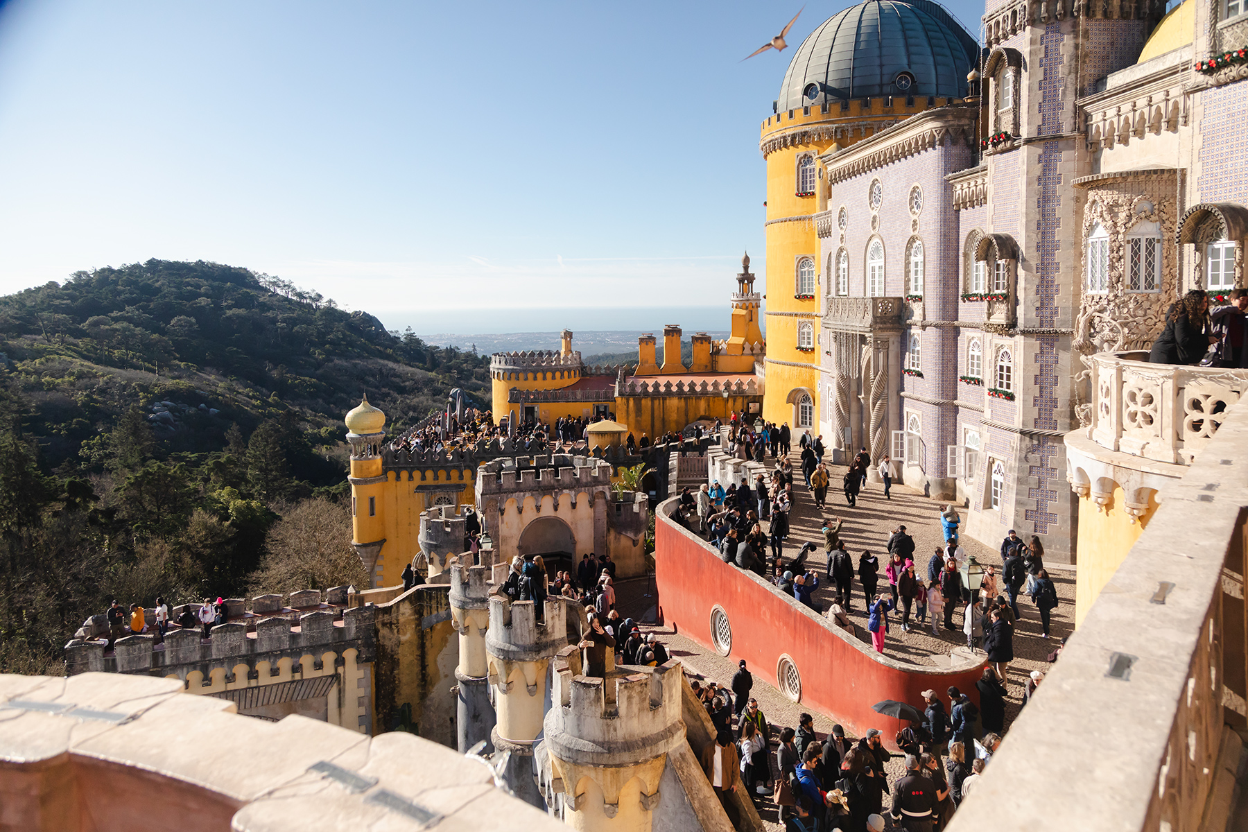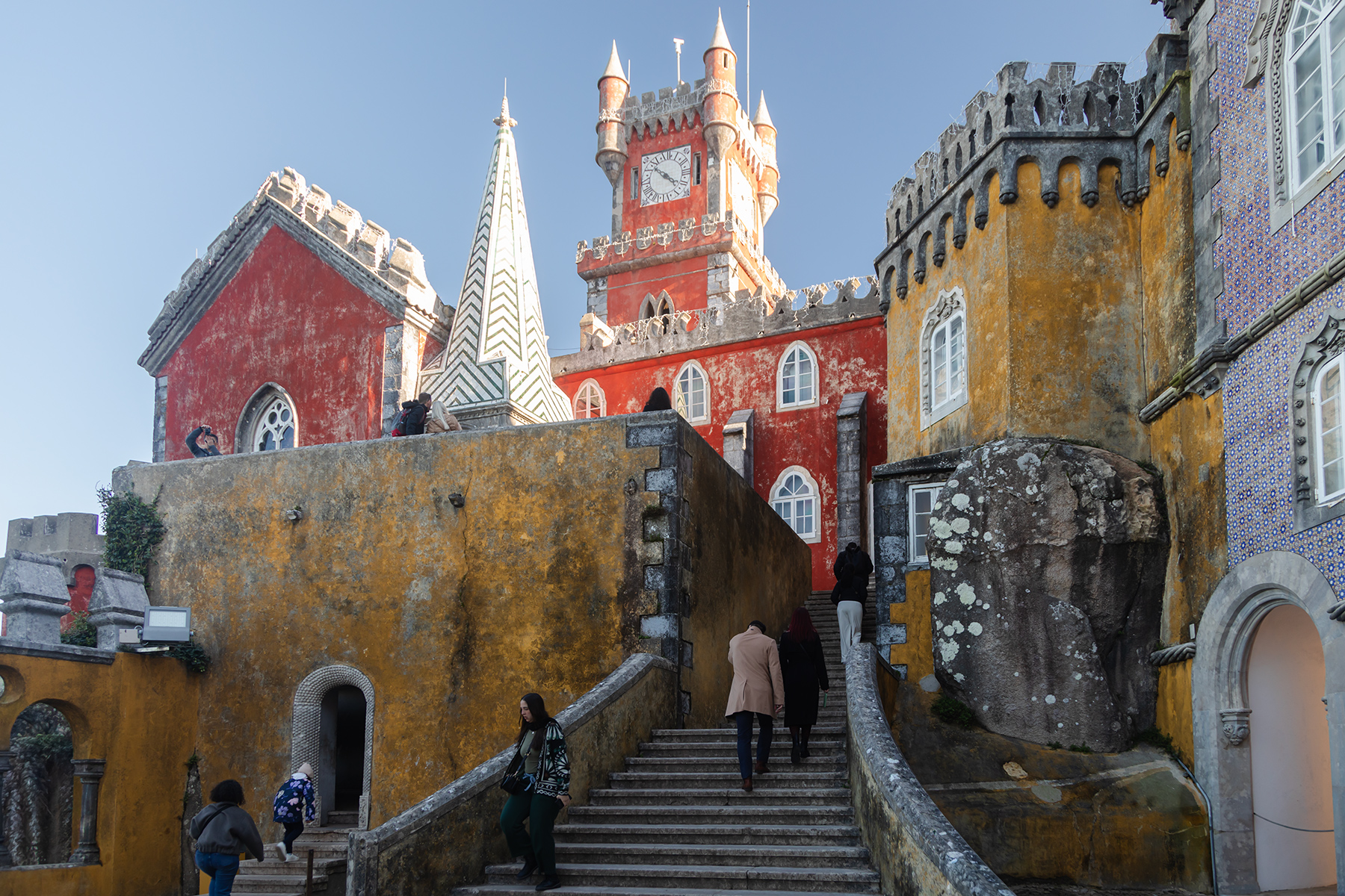 We started at the National Palace of Pena, an impressive red‑and‑yellow castle perched high above the town. The crowds were intense, but much of the exterior could be explored freely, while timed tickets gave access to the interior.