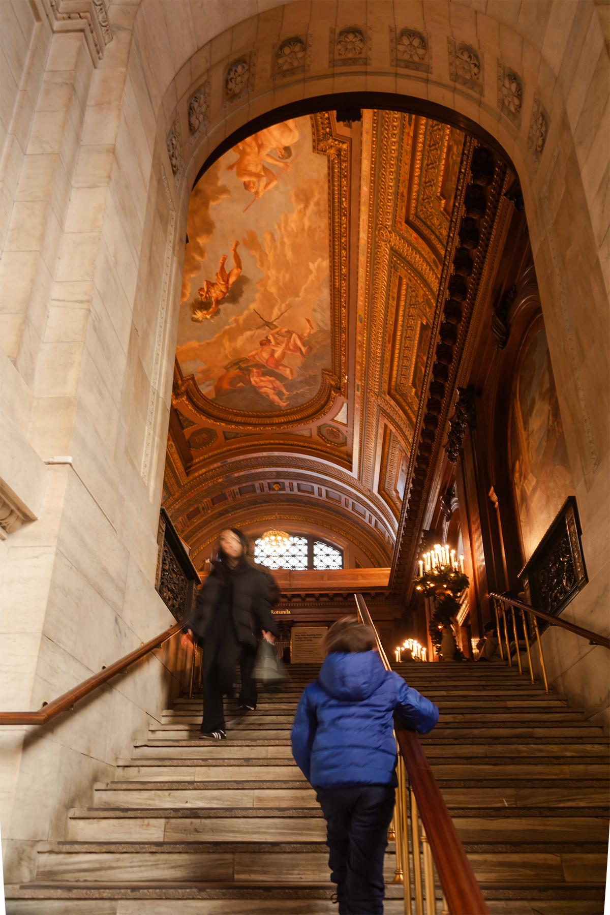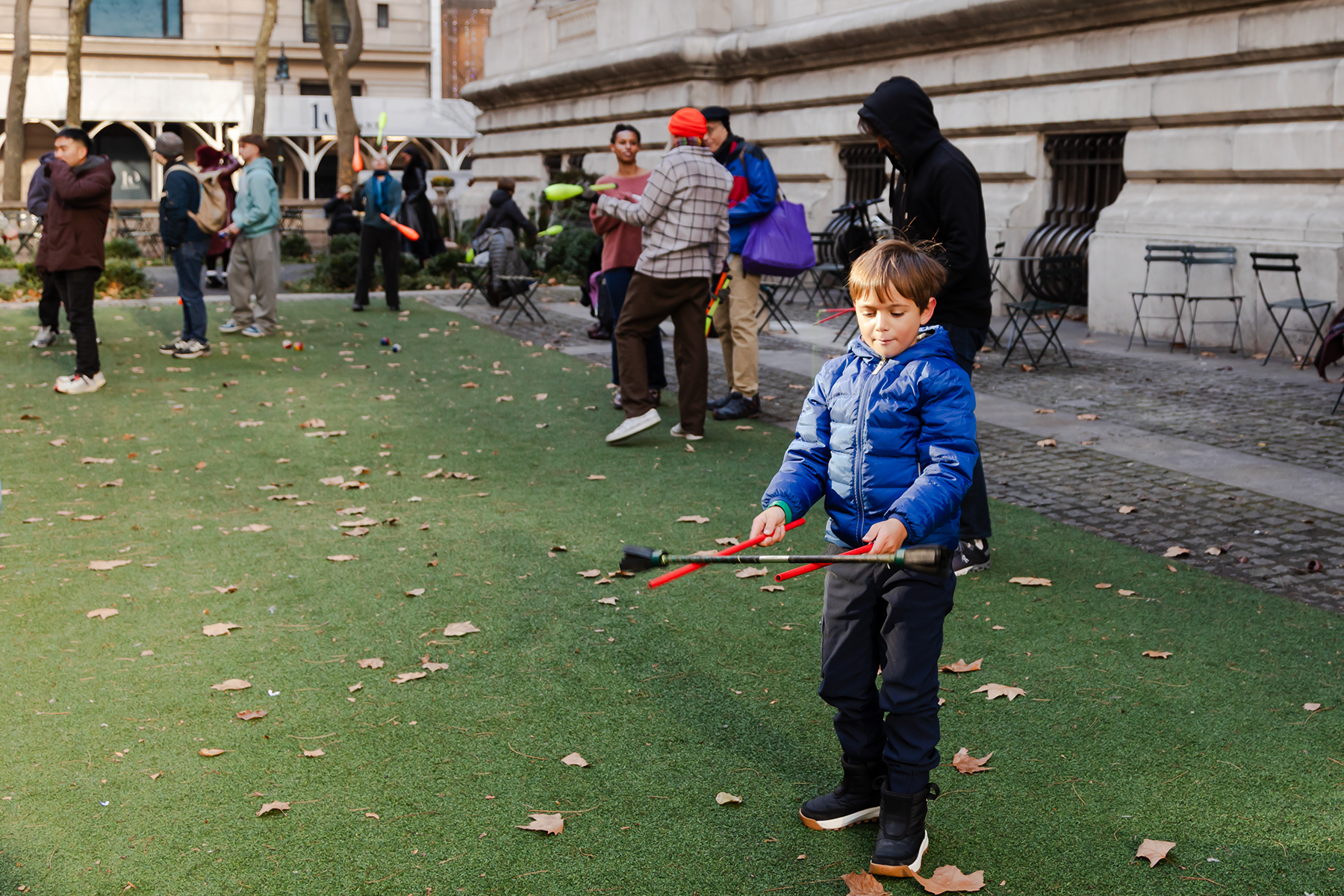 Lunch at Bryant Park was quickly abandoned — the crowds made it impenetrable. Instead, we stopped outside the New York Public Library, where there was a free learning event and S tried his hand at juggling before peeking inside the library.