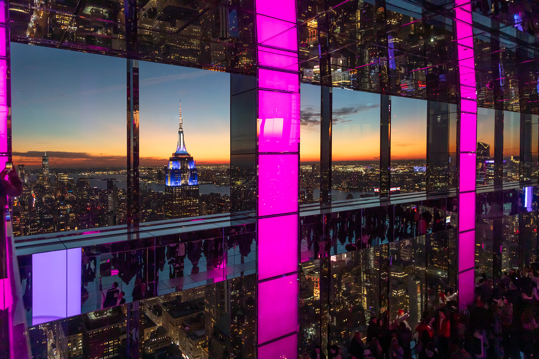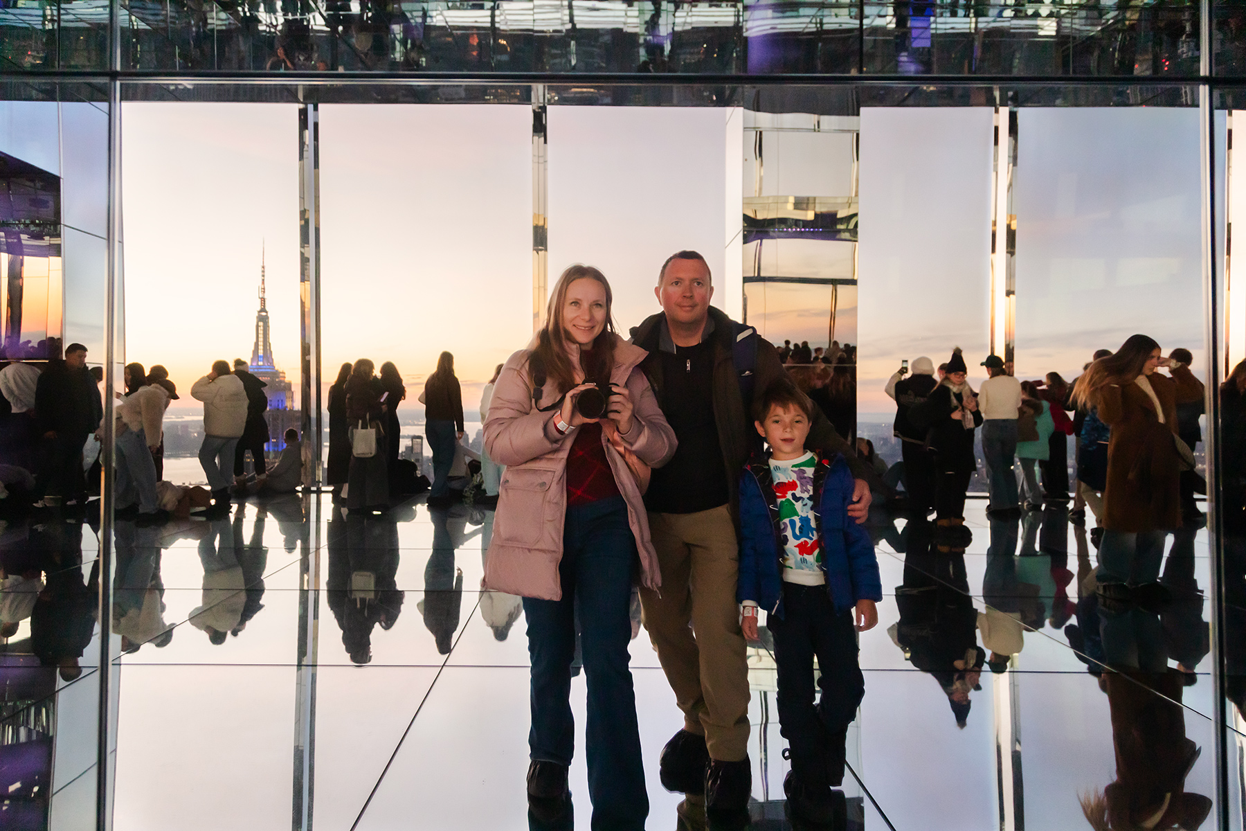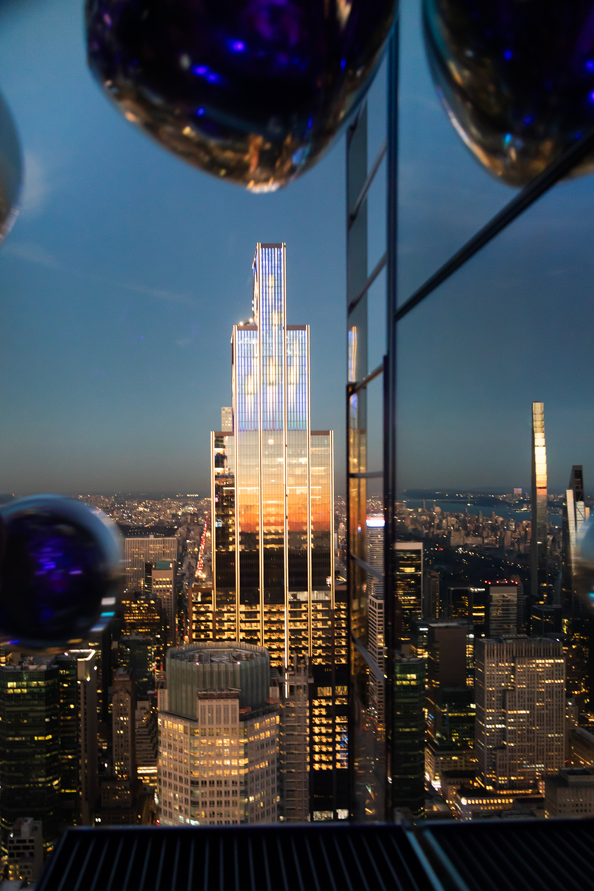 By mid‑afternoon, we had tickets to Summit One Vanderbilt, hoping to catch the sunset from above. After another long wait, we finally reached the top just in time to see the last glow of daylight fade. The views were stunning, and S’s highlight was the playful room filled with silver balls.